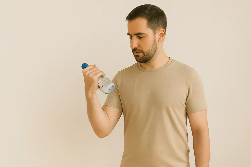 Mit einer kleinen Wasserflasche oder leichten Hantel: Ellenbogen dicht am Körper, Arm im rechten Winkel. Hebe und senke langsam.